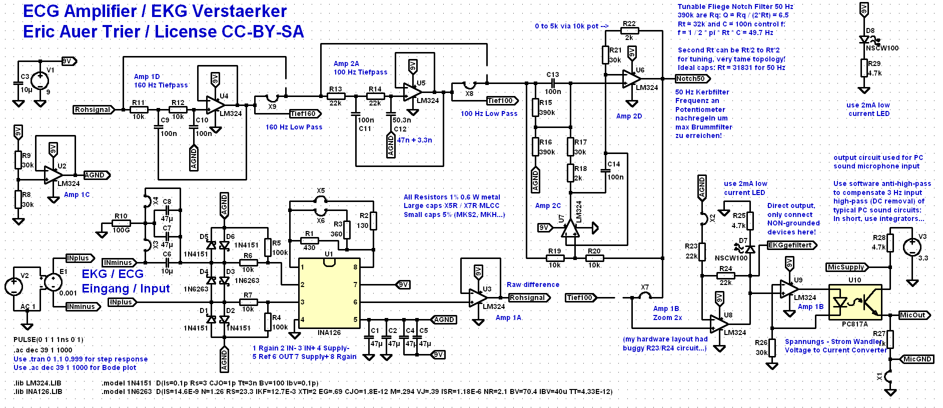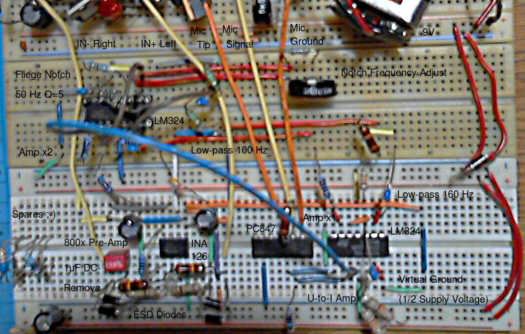 Batteriebetriebener EKG Verstärker, mit Allen-Key Topologie Hardware-Tiefpass von 160 Hz und 100 Hz von jeweils 40 dB/Dekade bzw. 12 dB/Oktave, stimmbarem 50 Hz Hardware-Kerbfilter nach Fliege, eingestellt auf Q=5 und möglichst genau 50 Hz. Verstärker über Optokoppler galvanisch entkoppelt, Verbindung mit PC über Mikrofoneingang Soundkarte, liefert 3,3 Volt über circa 2,2 KΩ. Eingangsstufe: INA126 Instrumentenverstärker v=800, 2x2 Schutzdioden, 110μF DC-Filter, 2x 10kΩ Eingang, 2x 100kΩ Eingangsimpedanz. Bei 10μF weniger Baseline Drift aber negative Artefakte nach R-Spitze und T-Welle. Ausgangsstufe: Spannungsgesteuerter sehr kleiner LED-Strom an Optokoppler, also geringe Belastung der Mikrofonversorgung.
