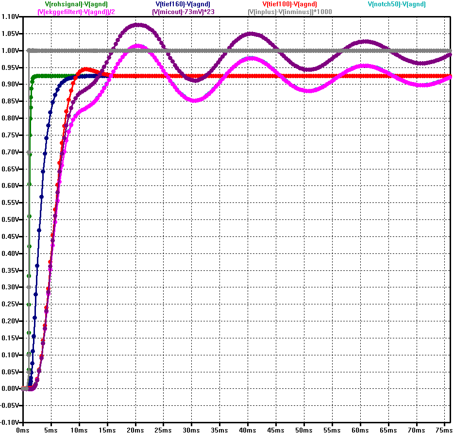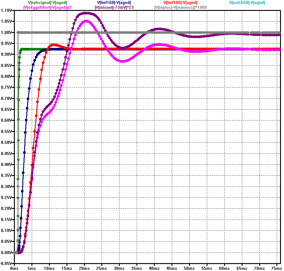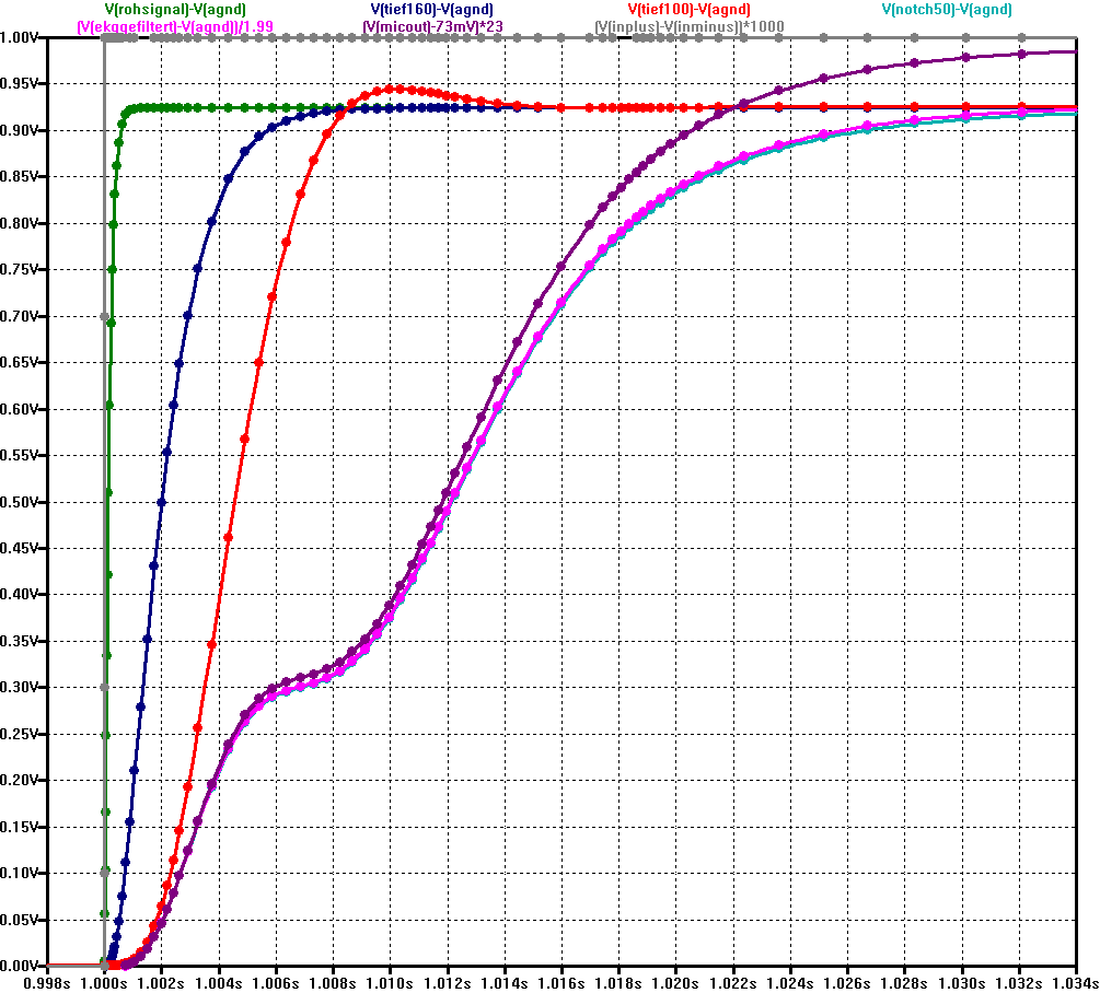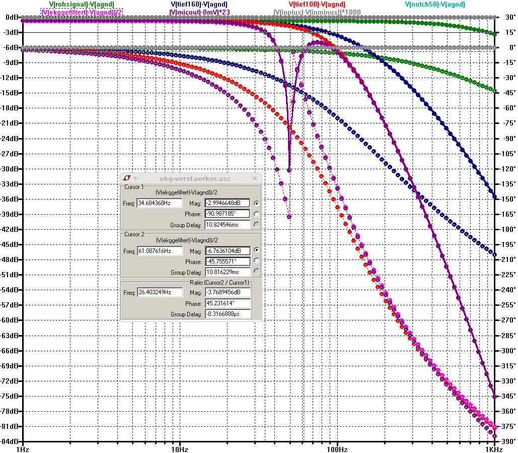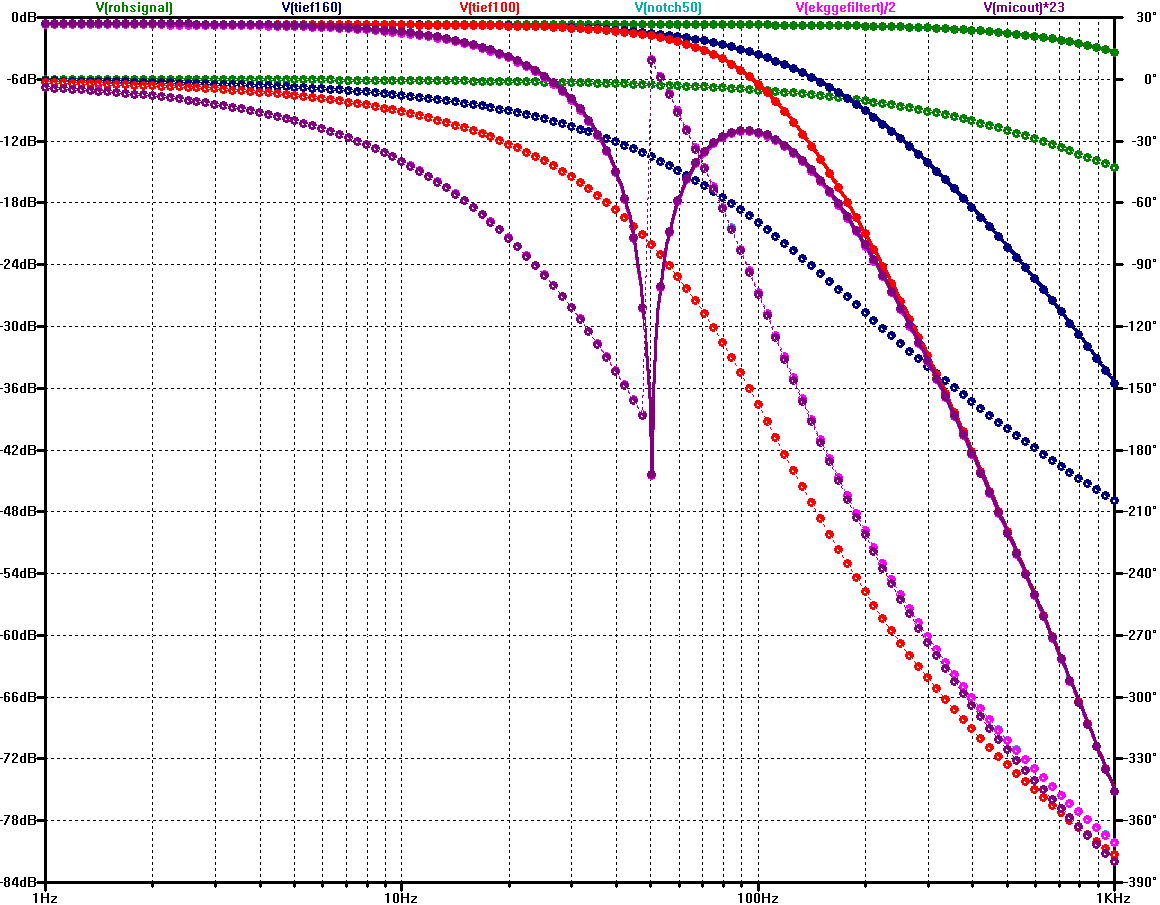 Der Vorteil der Sache ist, dass man jetzt direkt die Sprungantwort, Frequenzgang und Phasengang der Schaltung berechnen lassen kann. Man kann sogar ein ideales EKG-Signal (z.B. als WAV Datei) in (LT-) SPICE einspeisen und ausrechnen lassen, wie das Signal am Ausgang aussieht, also welche Verzerrungen auftreten. Was in der Simulation nicht zu sehen ist: Obwohl der Ausgang der Schaltung per Optokoppler isoliert ist, hat das Eingangssignal oft einen starken 50 Hz Brumm-Anteil von Netz-Einstreuungen. Ohne den Kerbfilter ist das Nutzsignal schwach im Vergleich zum mit verstärkten Netzbrummen. Bis auf Weiteres lasse ich also den Kerbfilter aktiv. Damit kann ich das EKG höher aussteuern bei der Messung per Mikrophon-Eingang des PC. Ein digitaler Kerbfilter würde zwar die 50 Hz perfekt und ohne Phasenverschiebung ausfiltern, aber bei der Messung wäre ein grosser Dynamikumfang nötig, also eine gute A/D Wandlung. Und EKG sind nicht direkt die Sorte Signal, für die die Eingangsfilter von Mikrophon-Buchsen entworfen sind...