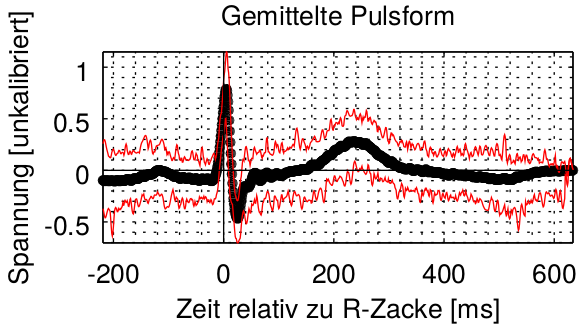 Mittelung über eine Messung von etwa 1 Minute reduziert Artefakte, zusätzliche digitale Kerbfilter auf 50 Hz und einige Oberwellen davon mit Octave. Schnittpunkte jeweils auf 225 ms vor der R-Spitze festgelegt.