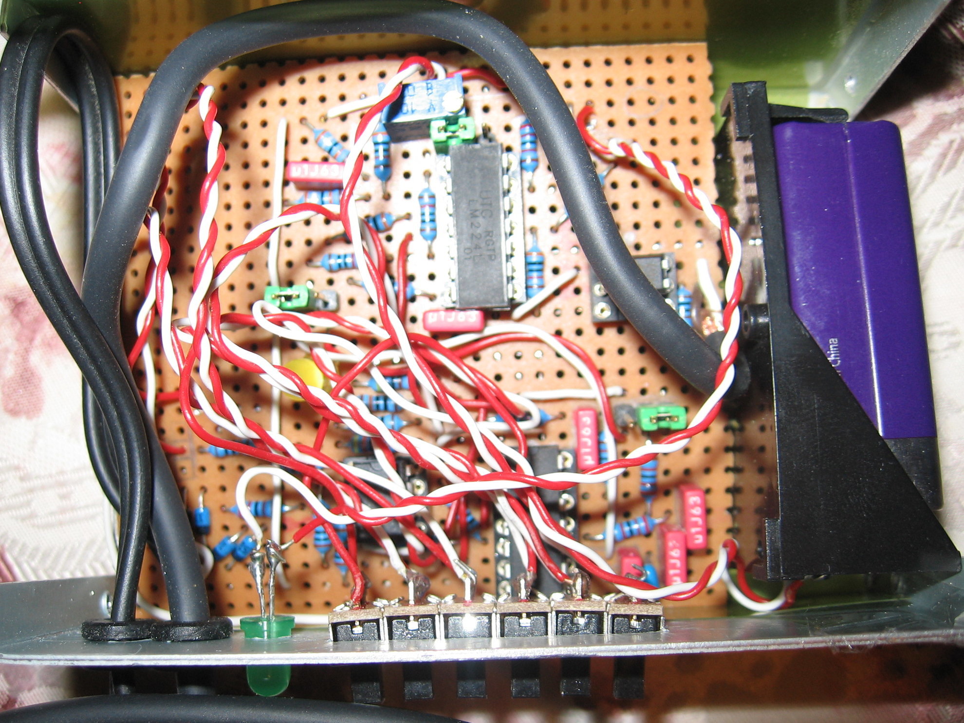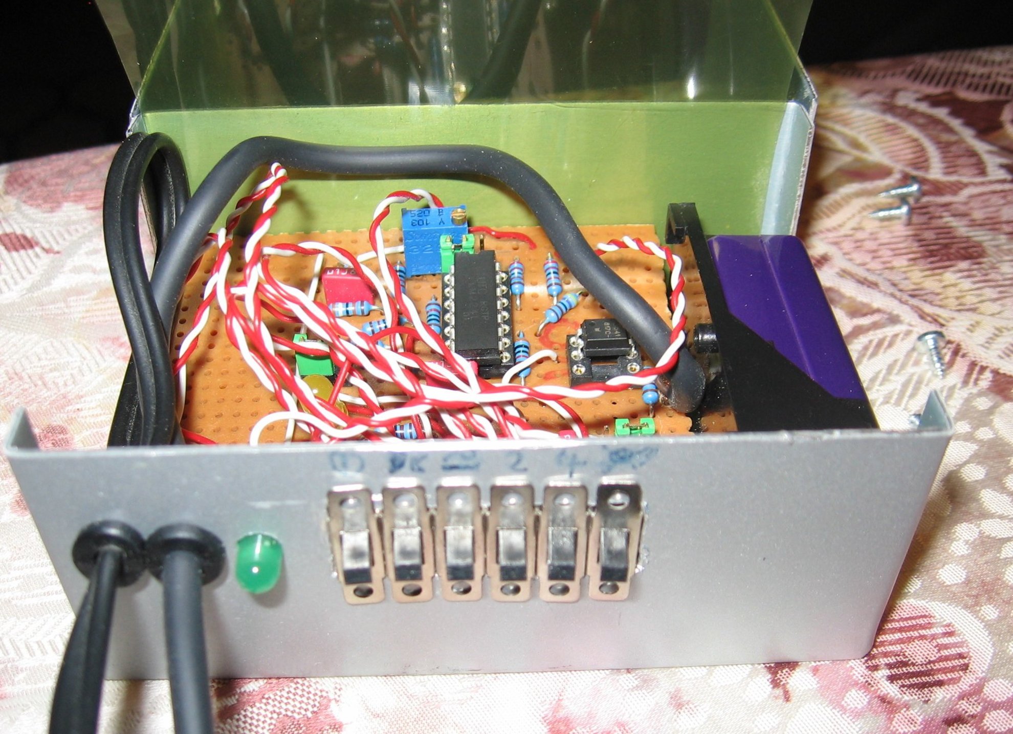 Man sieht lediglich 4 Chips: PIC Mikrocontroller, MCP3208 A/D Wandler, ein ULN2003 zum Schalten der Fingerbeleuchtung und ein LM324 um für Sensor- und Referenzspannung und Ausgangs-LED genug Strom zu haben. Da es 100e PIC Varianten gibt, würde eine Version mit internem 12-bit A/D Wandler und hohem Ausgangsstrom einige Chips einsparen. Eine dsPIC33 Version bietet dazu noch schnelle Mul/Div und 16-bit CPU. Der aktuell verwendete PIC hat zwar (unbenutzte) USB Gimmicks, aber nur 10-bit A/D, was unser AC Signal mit hohem DC Anteil nicht genau genug messen kann.